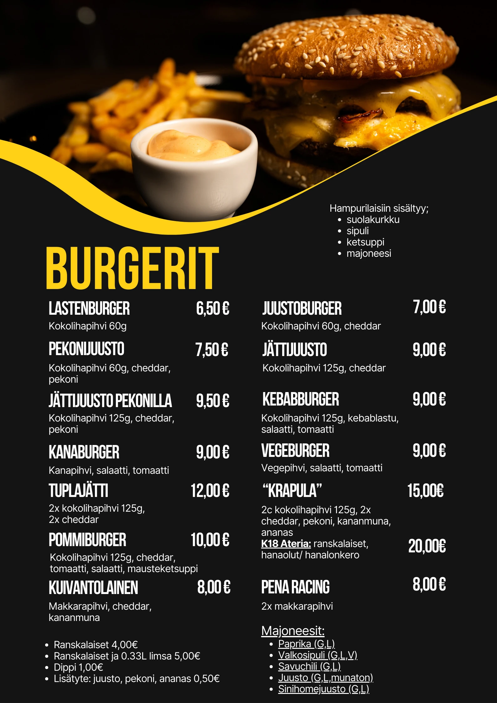 Kaikki muut hampurilaiset saa gluteenittomina, paitsi kana ja vege.kaikki maitoa sisältävät ovat laktoosittomia.